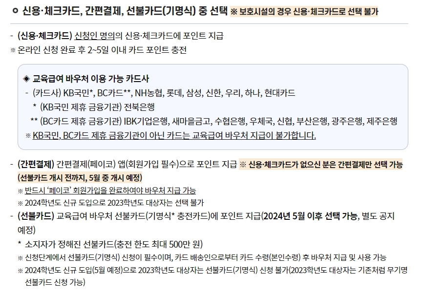 📌 교육급여 바우처는 하단에 나와있는 체크/신용카드로 충전이 가능합니다.