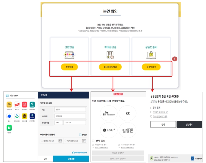 ⚡본인인증이 가능한 간편인증 / 휴대폰인증/ 공동인증서 중 하나를 선택